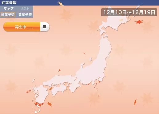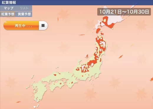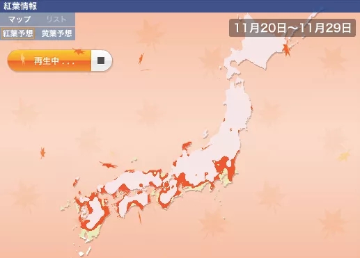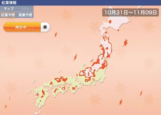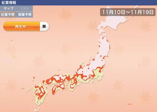日本气象情报网站weathernews公布了最新的红叶季预测,通过下面两张图,分别是以枫叶为主的红叶和以银杏为主的黄叶观赏日期对照。
