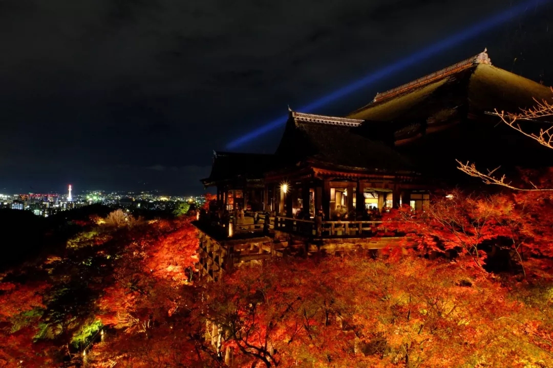 位于京都的清水寺每年进入红叶季后,都会开放夜晚的特别拜谒。清水寺是京都最古老的寺院,曾数次被烧毁并重建,本堂前悬空的清水舞台是日本国宝级文物,四周绿树环抱,春季时樱花烂漫,是京都的赏樱名所之一,秋季时红枫飒爽,又是赏枫胜地。